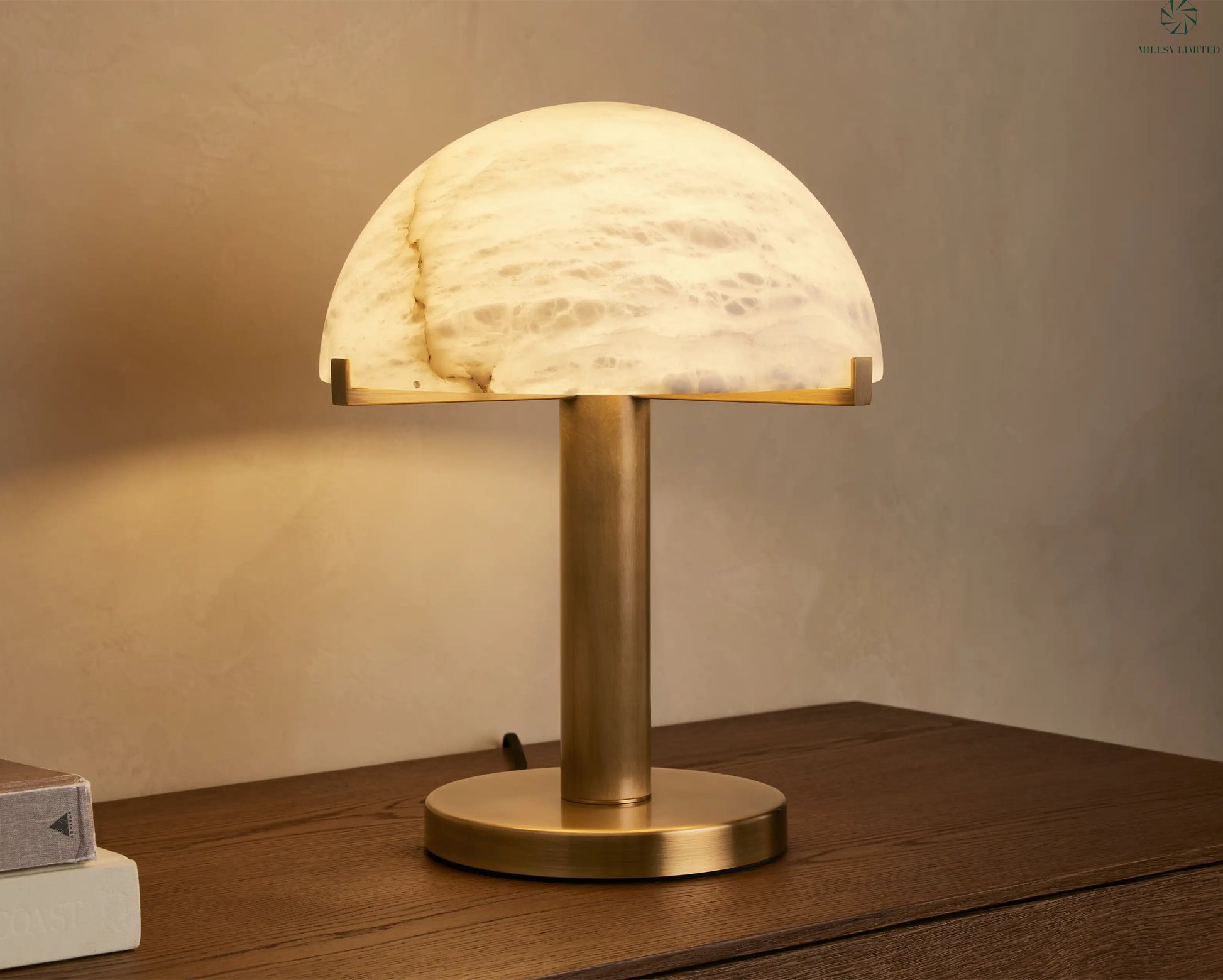 Our Sirocco table lamp perfectly blends the natural luster of green agate or alabaster with the warmth of solid brass, adding a touch of brilliance to any surface. The domed shade is designed to add a natural charm to your space, creating a soft ambiance while highlighting the natural texture of the stone.
